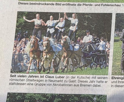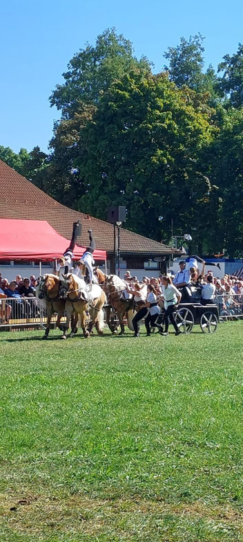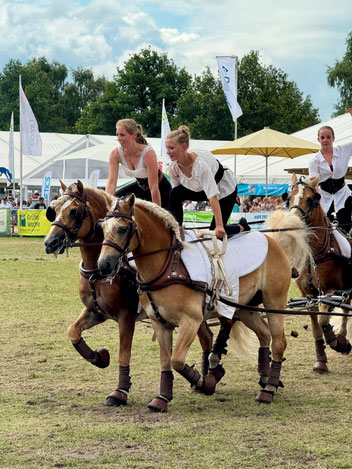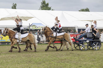 Wir haben Claus Luber und seinen Viererzug überfallen und seine Haflinger wieder in Beschlag genommen. Da wir "unsere" vier Hafis nun schon etwas kennen und wissen wie sie reagieren, konnten wir noch besser turnen und mehr zeigen als in Tarmstedt auf der Ausstellung. Viele Übungen klappen jetzt schon synchron und machen dadurch noch mehr her. Durch die "Trockenübungen" auf der Kutsche vom Tag zuvor konnten wir auch hier mehr Übungen einbauen und hatten vor allem einen Ablaufplan.