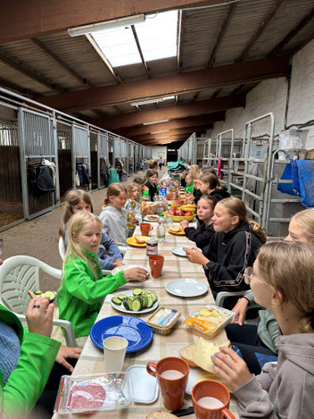 Nach dem Pferdefüttern und versorgen ging es erst einmal an die lange Tafel zum Frühstücken. Wir stellen fest, wir sind ganz schön viele Personen dieses Jahr!