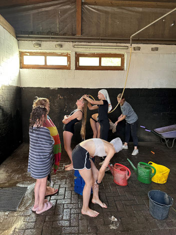 Damit wir nicht völlig verdreckt in unsere Schlafsäcke am Abend steigen und andere Stallmitglieder von unserem Gestank vertrieben werden, wird sich Abends in der Waschbox mit kaltem Brunnenwasser gewaschen. Es kostet zwar etwas Überwindung, aber danach fühlt man sich sauber und frisch.