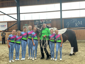 Nach der Mittagspause ging es weiter mit den Schritt/Schritt Maxi Gruppen, welche altersoffen ausgeschrieben waren. Unsere sehr junge Mannschaft III, die jüngste ist 6 Jahre alt, ging dort mit Kimmy an den Start. Es war der erste Voltigierstart für die Mädels und für Kimmy auf einem Voltigierturnier. Kimmy machte einen tollen Job und auch die Mädchen konnten sich in einem sehr großen und vor allem älteren Starterfeld einen fantastischen 7. Platz mit einer 6,0 sichern.